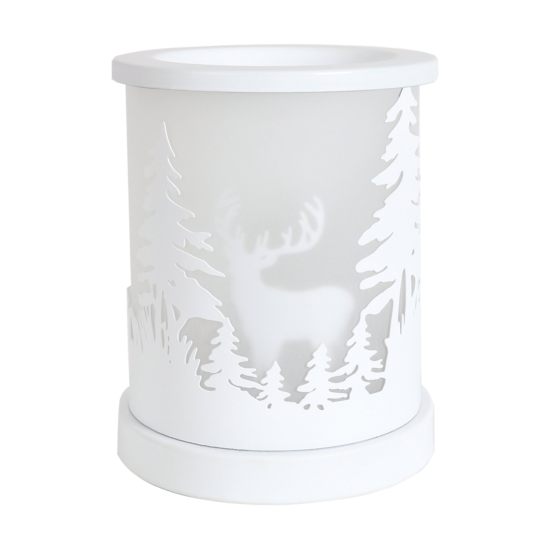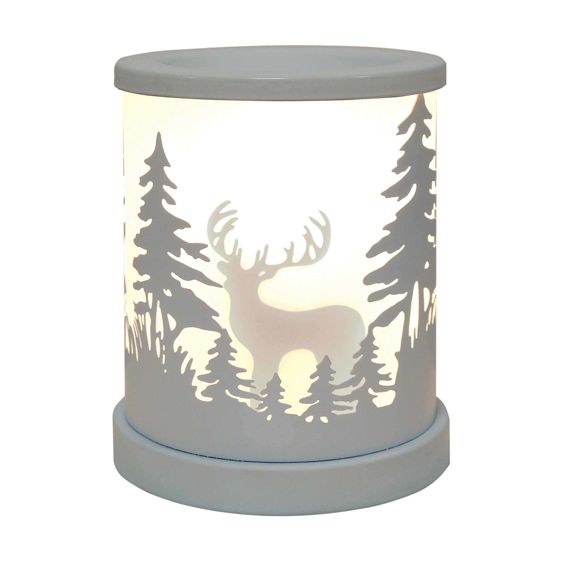 This cylinder shape melter has a beautiful silhouette stag design in a sleek finish. The intricate design showcases a shadow effect stag surrounded by cut out forest and tree patterns allowing light to shine through, giving off a homely feel whilst filling the room with your favourite wax melt fragrance.
