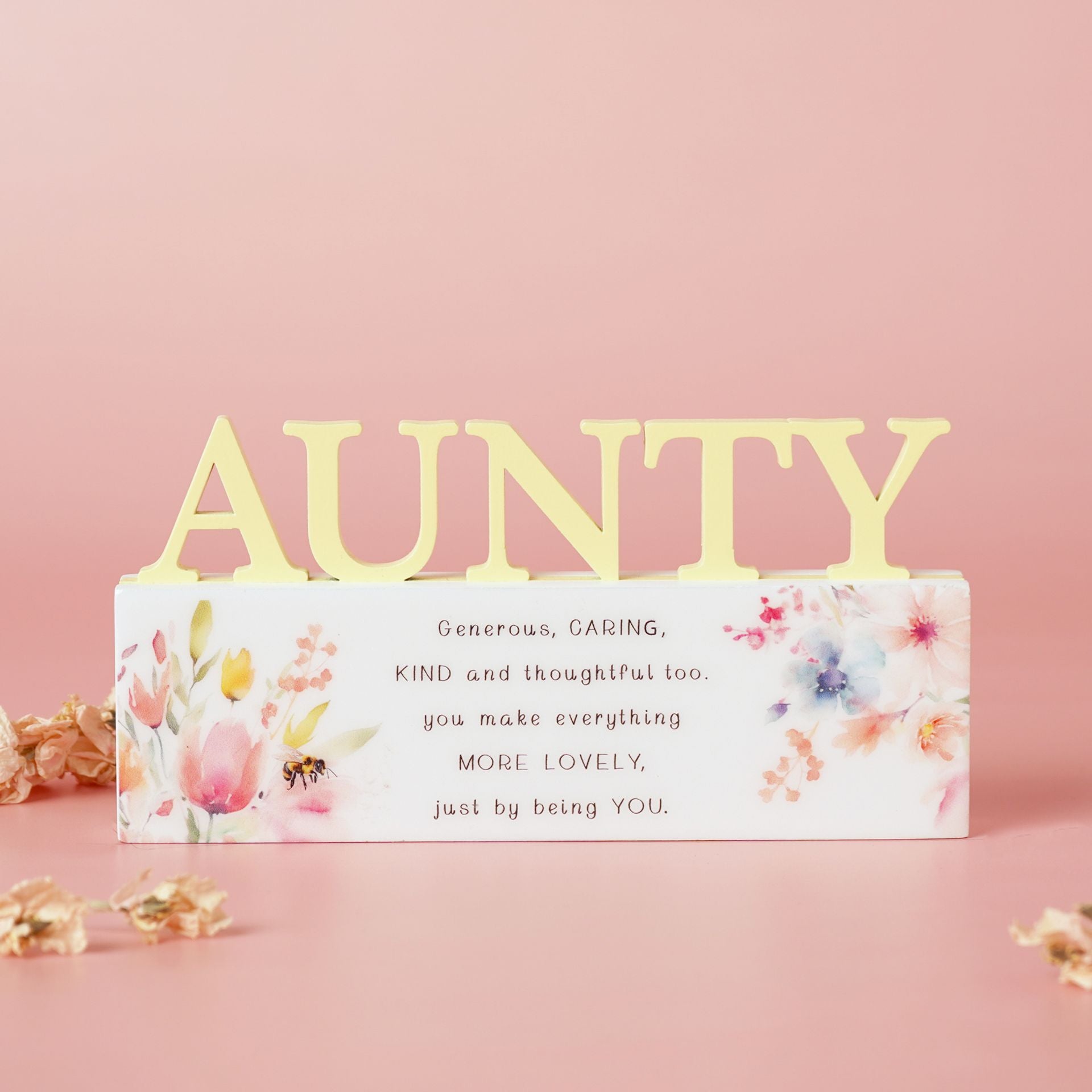 The Cottage Garden Floral Word - Aunty is a decorative block sign that pairs bold cut-out lettering with soft watercolour floral artwork and uplifting wording. Designed to sit neatly on shelves, mantels, or desks, it adds both colour and personality to the home. A thoughtful option for Mother’s Day, birthdays, or everyday gifting, it combines a standout design with meaningful detail, making it easy to style or give.